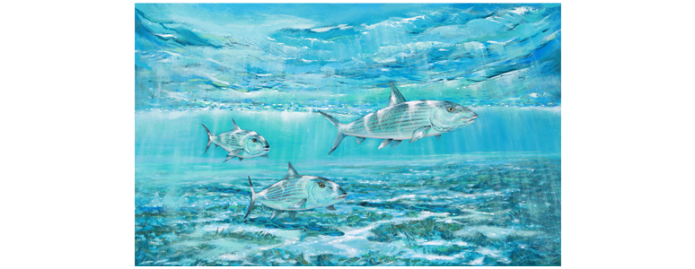 For most fly fishers the Bonefish is a great challenge. They're hard to catch and they're a great fighter on your light weight fly rod. My painting captures a small school of Bones prowling the flats for food and blending into the environment as they always do.